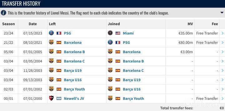 截至现在,梅西宛如一位在绿茵场上潇洒游走的侠客,先后为巴萨、巴黎圣日耳曼以及迈阿密国际效力。但奇妙的是,所有的转会都像是一场无需金钱交易的浪漫邂逅,以免签的形式达成。也就是说,梅西职业生涯目前产生的转会费依旧是那令人惊叹的0。